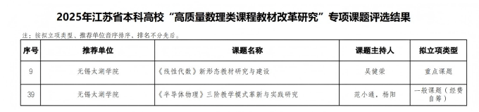 近日,江苏省高等教育学会公布2025年江苏省本科高校“高质量数理类课程教材改革研究”专项课题评选结果,Beat365申报的2项课题全部获批立项,其中吴健荣教授主持的“《线性代数》新形态教材研究与建设”入选重点课题,范小通博士主持的“《半导体物理》三阶教学模式革新与实践研究”获批一般课题。彰显学校了在数理类课程教材改革领域的扎实研究基础与创新实践能力。