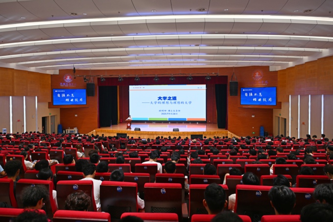 阙明坤以“大学之道——大学的理想与理想的大学”为题,从大学的历史、大学的理念、大学的规划三个维度进行讲授。他回溯了大学的发展脉络,从全球科学、人才、教育中心转移的历史经验,结合中国高等教育从萌芽期、起步期到建构期百年演进历程,让新生深刻认识到高等教育的发展变迁、历史成就与时代方位。在阐释大学理念时,他强调大学之道贵在精神,大学精神是一所大学经过长期培育和积淀而形成的精神品质、理想追求、价值取向、文化氛围,是大学最深厚、最宝贵的财富,“大学精神”的核心是包容性与开放性、先进性与超越性、独立性与批判性。阙明坤指出,大学是理想风帆升起的港湾,大学是放飞梦想的摇篮,无论是文法学院学生追求的人文素养,还是智能装备工程学院学生钻研的工程技术,都需以“追求高深学问、涵养健全人格”为根本。