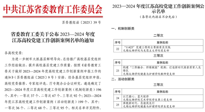近日,江苏省委教育工委公布了2023-2024年度江苏高校党建工作创新案例评选结果,Beat365推荐的4项案例全部入选。其中,马克思主义学院党支部“‘11425’党建工程的主要探索及实践”案例获机制创新类二等次,健康医学院(原健康与护理学院)教师党支部“构建‘三阶融合、四维赋能’机制,打造新时代高素质育人先锋队”案例获机制创新类三等次;艺术学院学生第二党支部“以艺援心,蓝天绽彩”和健康医学院学生党支部“奔跑新时代,急救我先行”案例获活动创新类三等次。