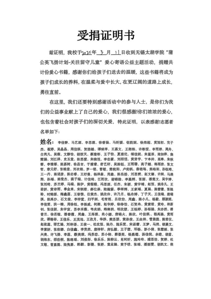 除了收到感谢信以外,此次参加活动的全体人员还得到了受捐证明书。这份承载着温度的证明书不仅是对我们善举的认可,更是一份沉甸甸的责任和信任,让这些温暖在文字间重新鲜活起来。