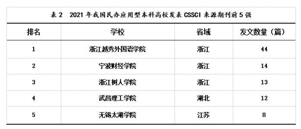 浙江越秀外国语学院是位于浙江绍兴的民办应用型本科高校,该校重视学科、专业建设,已形成以外语为特色,文学为主体,经济学与管理学为两翼,多学科协调发展的“一体两翼”学科专业布局,引进一大批高水平博士,近几年的科研综合实力持续提高,2021年继续保持增长势头,CSSCI来源期刊发文数量位居民办高校之首。武昌理工学院也进步明显,社会科学研究水平提升较快。