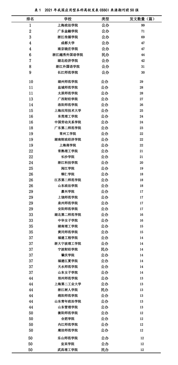 课题组对应用型本科高校的教学、科研和社会服务进行综合评价,其中科研水平的评价包括论文、专利、课题、获奖等,论文的评价标准之一是“中文社会科学引文索引”(CSSCI来源期刊)发文数(评价院校须作为第一机构,不包含CSSCI扩展版)。CSSCI数据库由南京大学中国社会科学研究评价中心开发研制而成,从全国的中文人文社会科学学术性期刊中精选出学术性强、编辑规范的期刊作为来源期刊。在CSSCI来源期刊发表论文是国家社会科学基金课题结题的必要条件,是教育部人文社会科学课题结题时“免予鉴定”的必要条件,也是国内大多数高校人文社科教师职称晋升的重要依据,受到高校人文社科领域学者的高度重视。