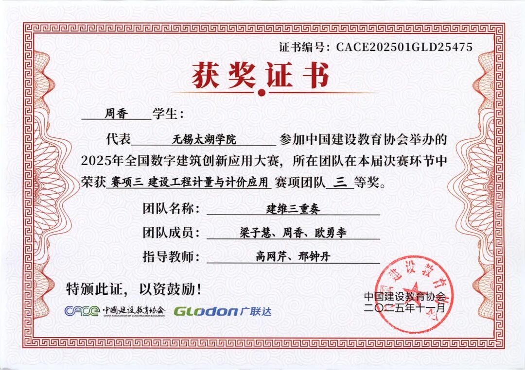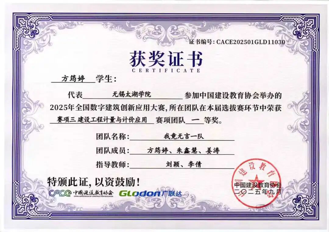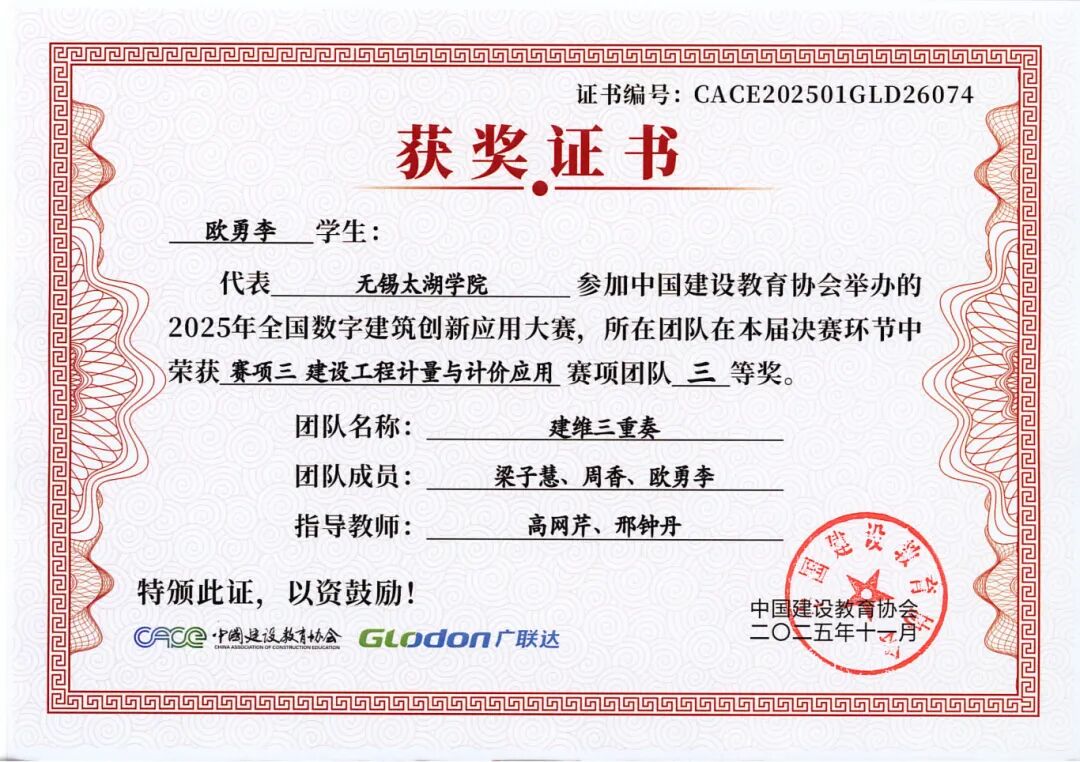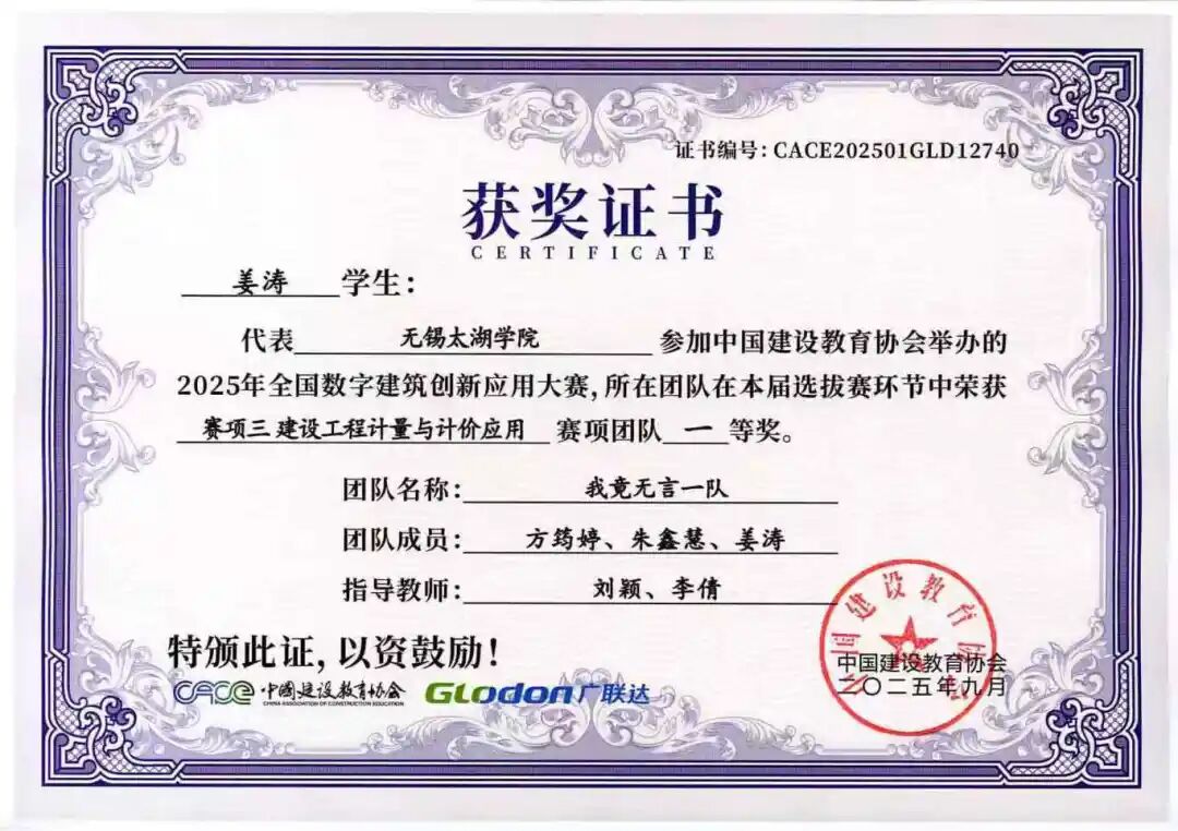 谨向所有获奖团队及指导老师表示热烈祝贺!期待智能建造学院学子以此大赛为新起点,持续深耕数字建筑技术,不断提升实践能力,未来成长为建筑数字化领域的中坚力量。学院也将继续完善人才培养体系,为智能建造产业输送更多优秀人才,助力我国建筑行业数字化转型升级不断迈向新高度!